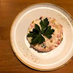 Соус, ветчина, бекон, огурцы соленые, сыр моцарелла, помидор, зелень
