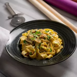 Основной ингредиент на выбор, лук, грибы, сливки, сыр моцарелла