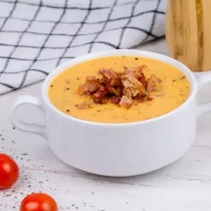 Сырный соус, ветчина, куриная грудка, копченые колбаски, помидор, сыр фета, сыр моцарелла, зелень