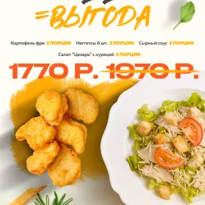 Картофель фри 2 порции + наггетсы 6шт 2 порции + сырный соус 2 порции + салат Цезарь с курицей 2 порции
